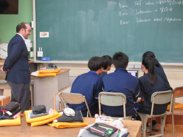 16日(木)、3年生2クラスの英語の授業で「OBL」(オンライン ブレンディッド ラーニング)が行われました。これはタブレット上にいる外国の方々と英会話をする活動です。