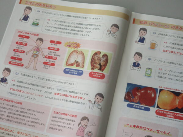 未成年者によるタバコや酒の害について学ぶ。また、近年問題となっている若年層による急性アルコール中毒の危険性についても触れ、将来にわたり行動選択ができる力を身につける。
