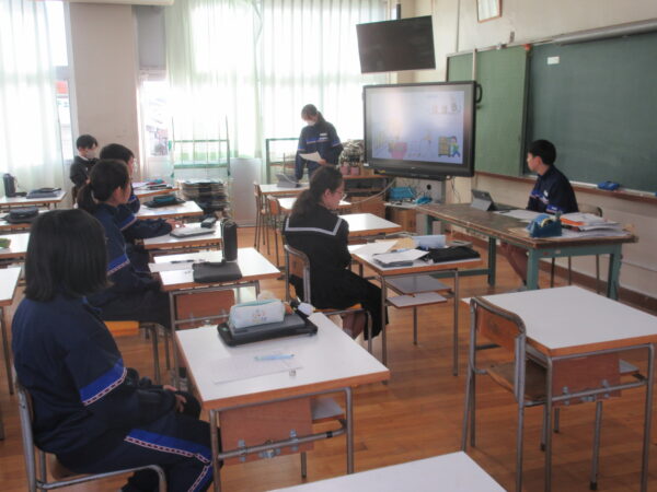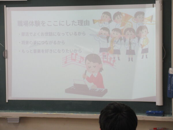 1人あたり2分30秒程度のプレゼン内容は、主に①職場体験での学び、②なりたい自分とは?、③そのために今できることは何か、の3つです。手書きによるフリップを用いたり、タブレットによるパワーポイント資料を用いたり、各自工夫を凝らした発表でした。
