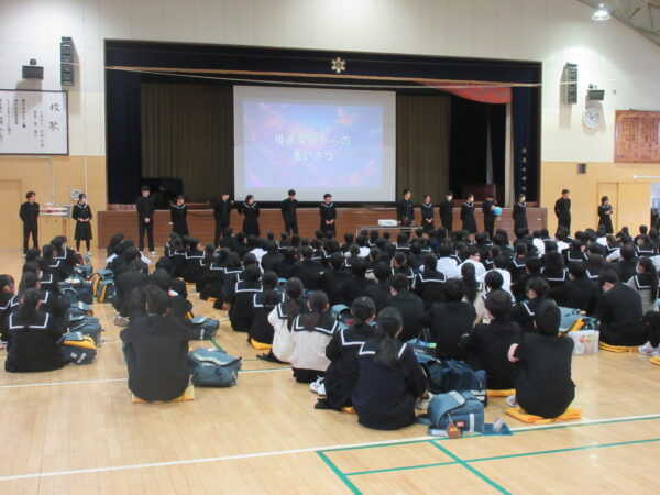 各学年で集会を実施し、冬休みの過ごし方について考える場面がありました。短い冬休みではありますが、年末年始を含む休みです。積極的にお家の手伝いをしましょう。また、3年生は受験生としての冬休みです。大変だと思いますが自分の将来につながる時間を大切にして過ごしましょう。