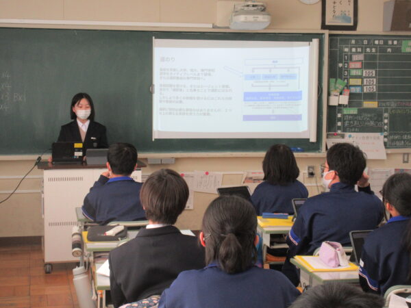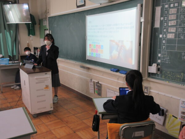 興味のある職業における、「仕事内容」「道のり」「SDGs活動」「自分とのつながり」等を発表しました。自分が将来目指す方向性を知ることができたでしょうか。